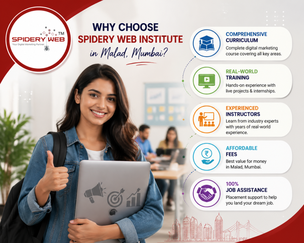 Spidery Web Institute offers a comprehensive curriculum, hands-on training, expert instructors, and job placement support, making it the best choice for aspiring digital marketers in Malad, Mumbai.